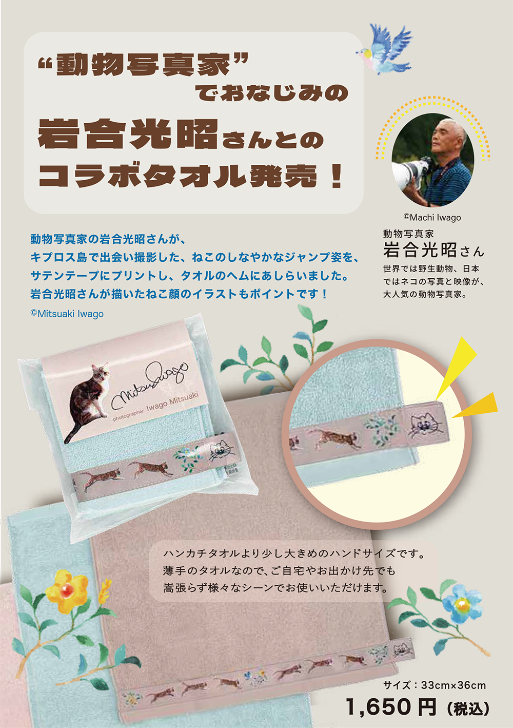 この度、動物写真家 岩合光昭さんとのコラボタオル「キプロス島のねこジャンプ」が出来上がりましたのでお知らせいたします。