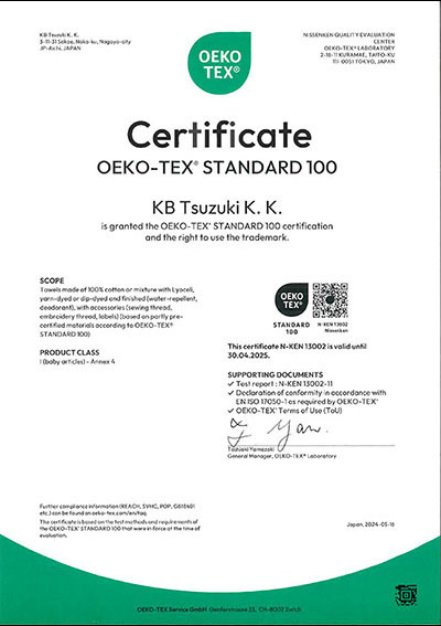世界の安全基準であるエコテクス中でも一番厳しいクラスI(ベビー基準)を取得しています。